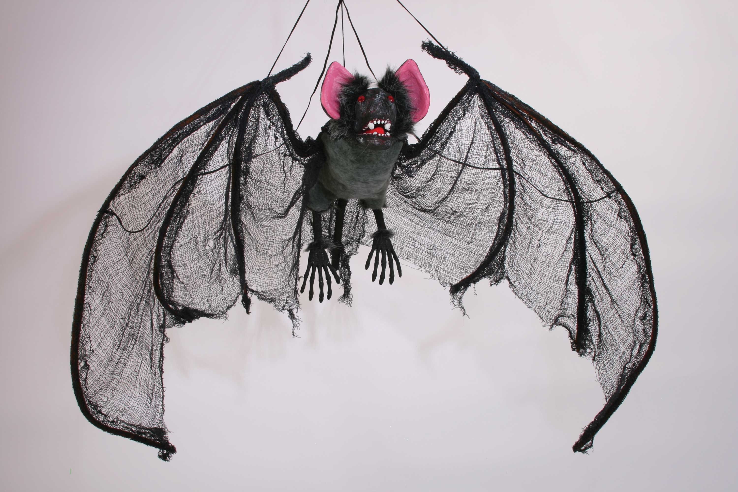 Огромная летучая мышь - это подвесная фигура, достигающая в размерах 180 см. Такую мышь вы можете повесить около входа и в любом другом месте на Хэллоуин. У мышки широко раскинуты крылья и виднеются клыки. Пришедшие к вам гости, будут жутко напуганы при виде этой огромной летучей мыши.