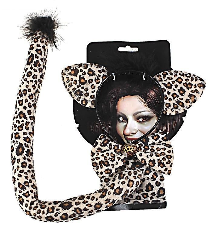 Набор леопард для перевоплощения в дикую кошечку, которая способна соблазнить даже самого опасного тигра. Комплект состоит из 3-х предметов и включает в себя хвост, бантик и ободок с ушками леопардовой расцветки.