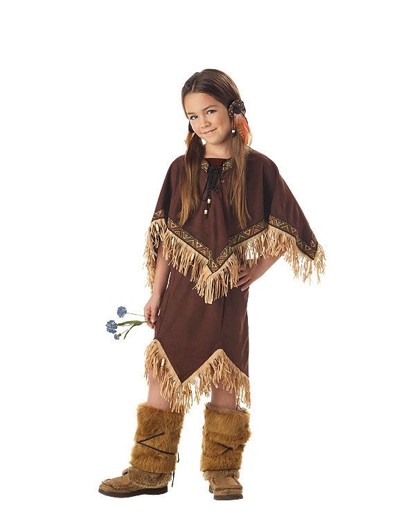Костюм индейской принцессочки выполнен в коричневом цвете. В комплект входит платье с бахромой, пончо с бахромой, пушистые накладки на обувь, а также красивые резинки для волос. В этом наряде ваша девочка будет выглядеть забавно и весьма мило.