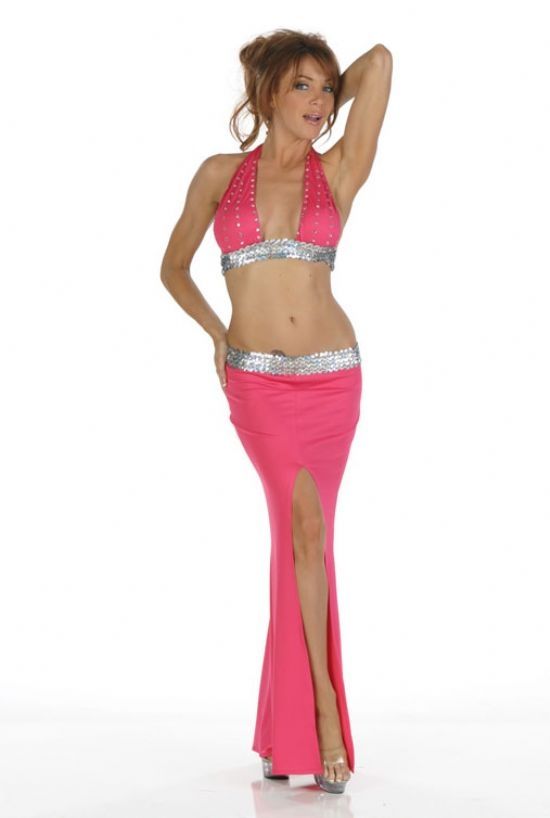 Топ и длинная юбка в розовом цвете украшенные паетками.