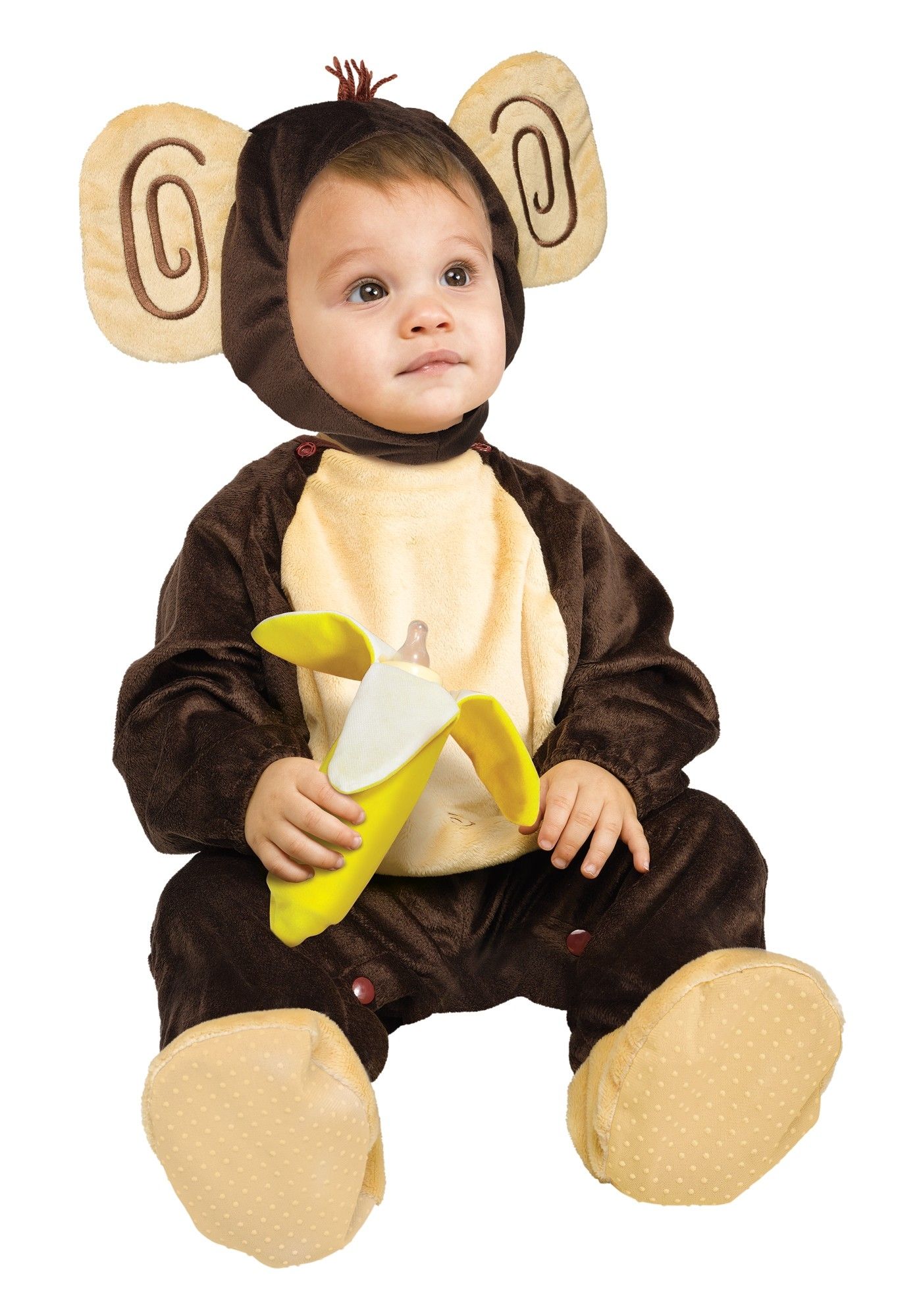 Костюм малыша обезьянки выполнен из мягкого коричневого материала. В комплект входит комбинезон, капюшон с ушками обезьянки, а также чехол для бутылочки в виде банана.