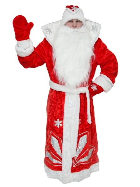 В комплекте длинная шуба, украшенная серебряными узорами из парчи, также красная шапка с меховой отделкой и серебристой снежинкой, белый пояс, варежки и мягкая длинная борода белого цвета.