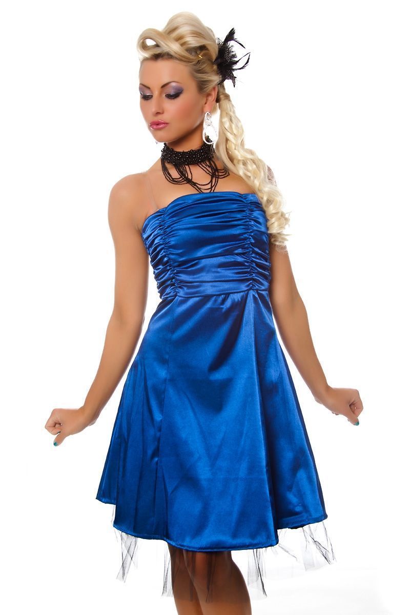 Синее платье без бретелек выполнено из атласного блестящего материала. Гофрированный верх и расклешенная юбочка в форме колокольчика - прекрасное изящное сочетание. К подолу платья прикреплен черный сетчатый материал. Сзади на спине имеется молния.