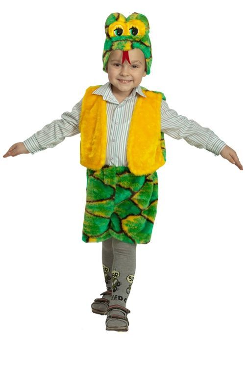 В комплект праздничного костюма входит яркая двухцветная жилетка: жёлтая спереди и зелёная, с рисунком «змеиная кожа», сзади. Короткие шортики выполнены из качественного искусственного меха, зелёного цвета с рисунком «змеиная кожа». Завершает детский костюм оригинальный головной убор, имитирующий змеиную голову с глазками и язычком.