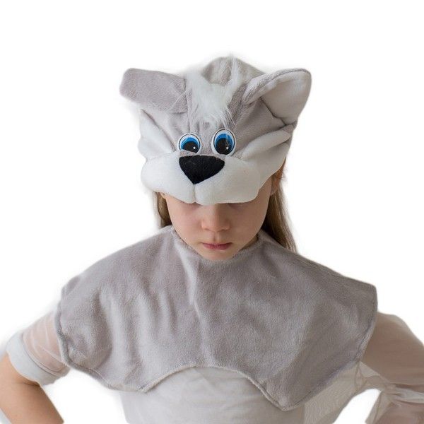 Комплект Котенок эконом выполнен в сером цвете из мехового материала. В комплект входит накидка на липучке, а также шапочка-маска в виде мордочки котенка с ушками.
