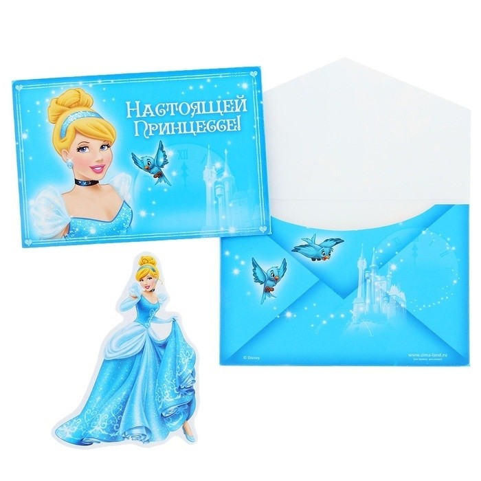 Подарочный конверт с открыткой Золушка - яркий голубой прямоугольный конверт, с надписью "Настоящей принцессе". Конверт украшен портретом диснеевской Золушки и изображением птичек. Также к конверту прилагается небольшая открытка в виде Золушки в бальном платье.