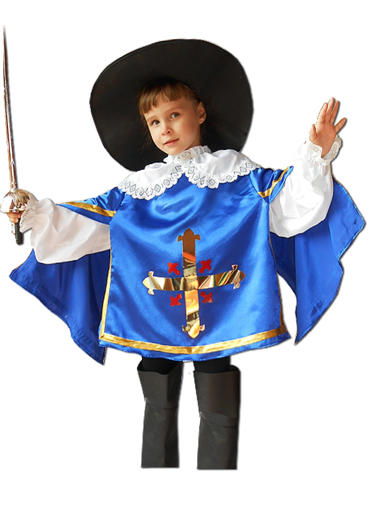 Костюм Короля мушкетеров включает в себя синий плащ-накидку из атласного материала, украшенный золотистым крестом и белым кружевным воротничком. К плащу пришиты белые рукава. Также комплект дополняют накладки на обувь в виде высоких сапог и шляпа.