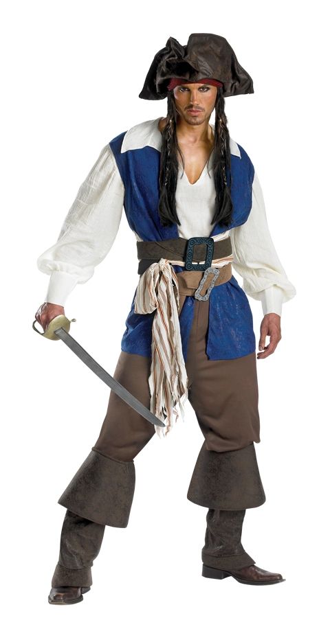Костюм Капитана Джека Воробья включает в себя пиратскую рубаху с синим жилетом, пояса, коричневые брюки, накладки на сапоги, пиратскую шляпу и бандану с косичками. Меч в комплект не входит, но его можно приобрести у нас отдельно, а также другие аксессуары для того чтобы завершить свой образ.