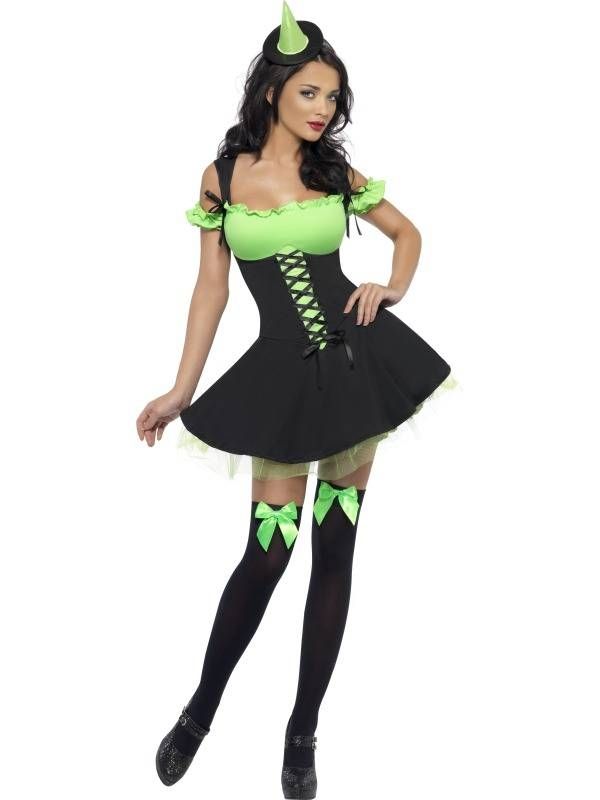 Костюм злющей ведьмы это платье с зеленым верхом и широким подолом, маленькая шапочка классической для ведьм формы. Чулки продаются отдельно, их можно найти на нашем сайте. Для дополнения образа можно приобрести метлу.