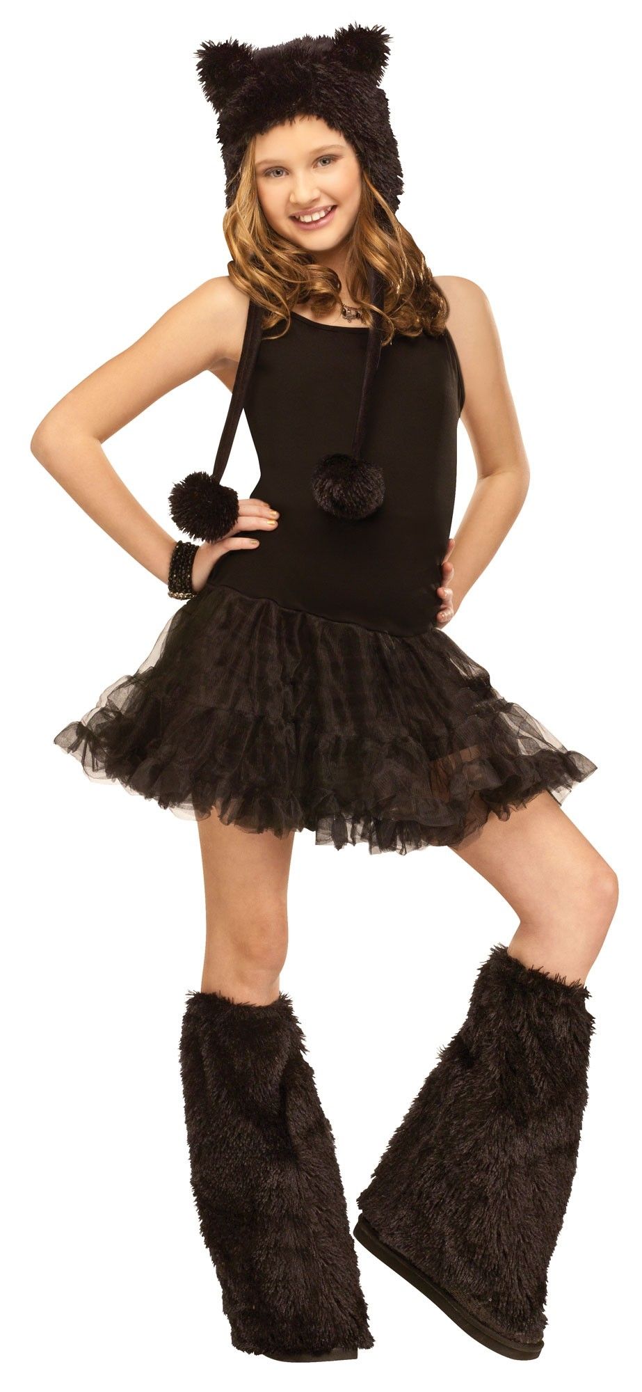Плюшевый набор черной кошечки - это мягкий капюшон с ушками и прикрепленными помпонами на веревочках. К капюшону прилагаются черные пушистые накладки на сапоги. Набор выполнен в черном цвете.