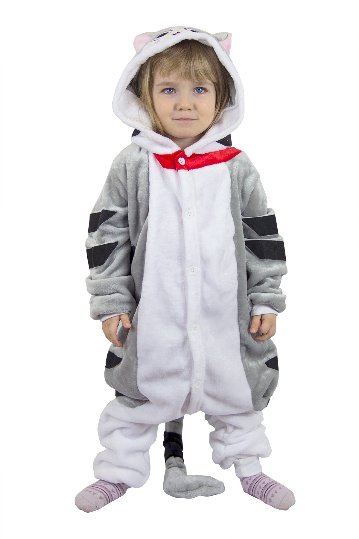 Детская пижама кигуруми Серый Кот - мягкая плюшевая пижама, выполненная в образе анимешного котика. Кигуруми серого цвета с черными полосками и белой грудкой. К пижаме пришит забавный длинный хвост, а капюшон выполнен в виде мордочки котика.