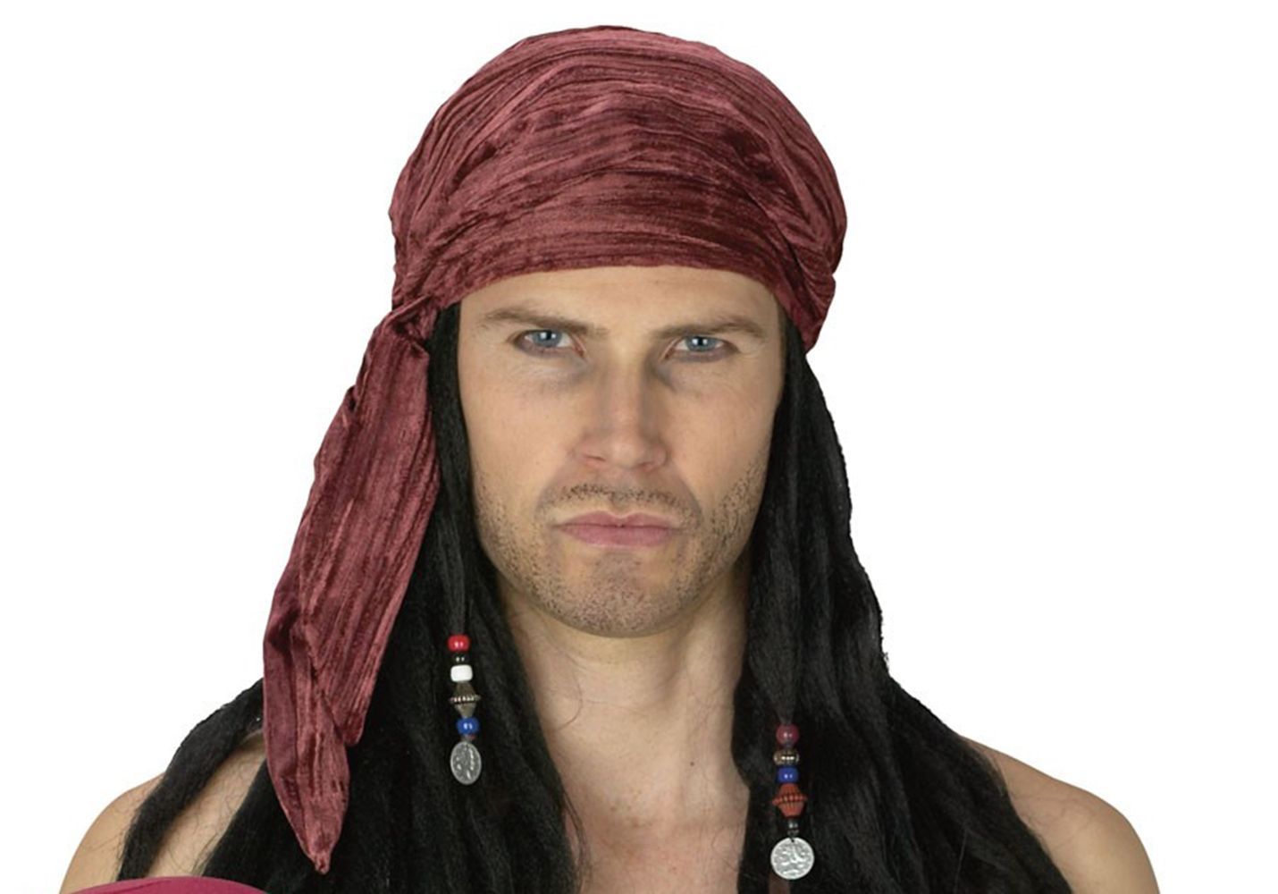 Бандана с дредами Deluxe представляет собой велюровую бандану бордового цвета. К ней прикреплены черные волосы, заплетенные в дреды. На передних дредах имеются украшения из бусинок. Такой аксессуар подойдет для образа Капитана Джека Воробья.