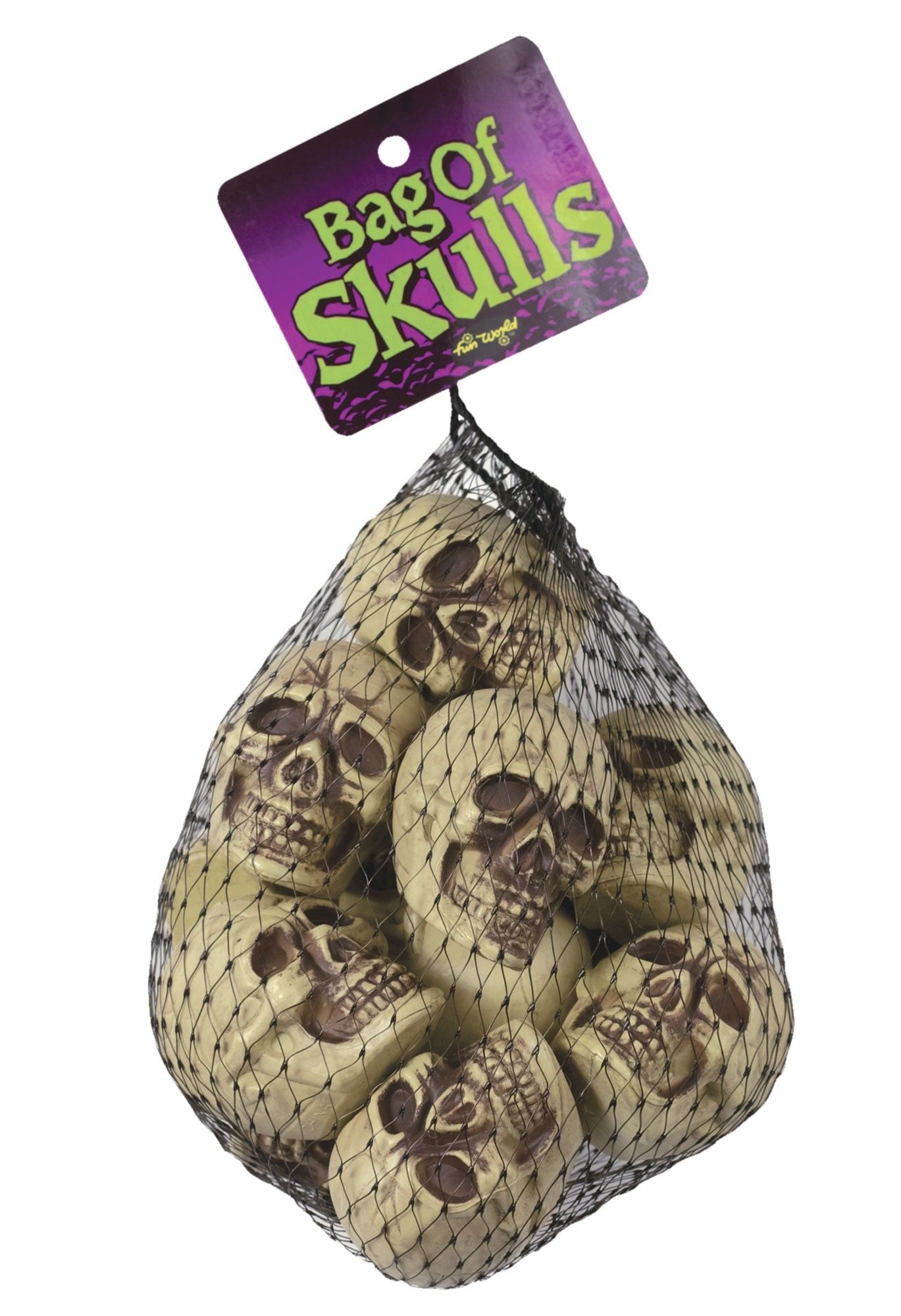 Сумка с бежевыми черепами - это идеальный аксессуар для Хэллоуина или Пятницы 13. В сетчатой сумке находится 12 черепов цвета натуральной кости с коричневым покрытием на вырезах. Такую сумку можно повесить на дверь или подвесить под потолок.