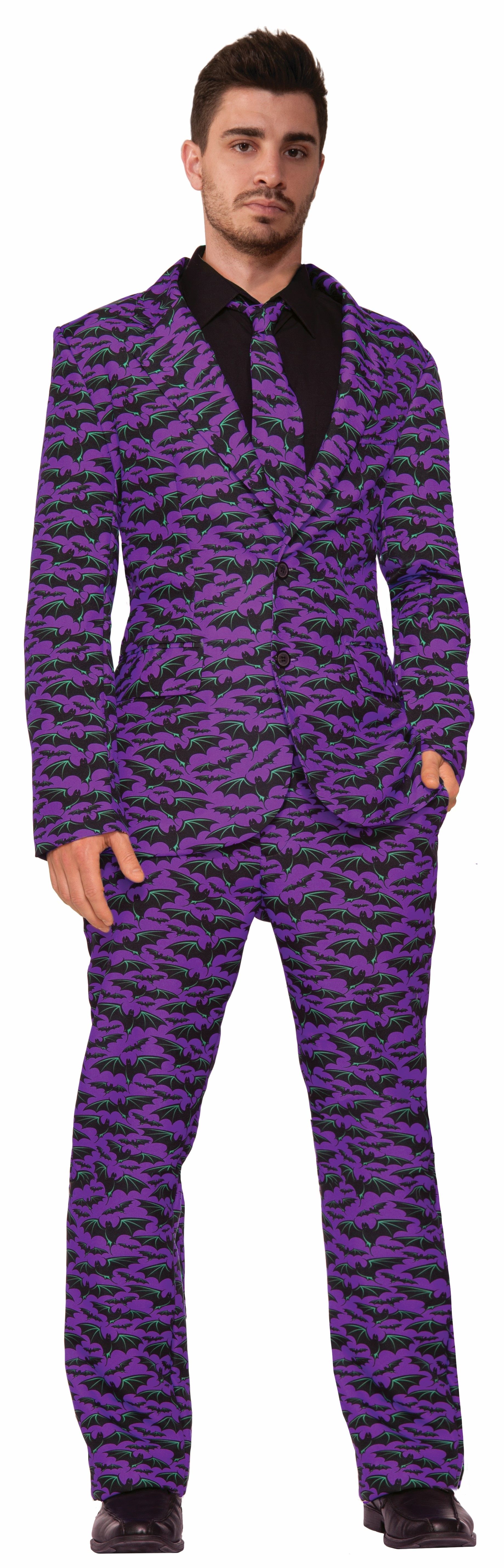 Костюм с летучими мышами - фиолетовый костюм, который включает в себя пиджак, прямые брюки, а также фиолетовый галстук. Костюм украшен принтом в виде множества летучих мышей.