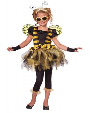Детский костюм солнечной пчелки включает в себя короткое платье с пышной пачкой, черные короткие перчатки без пальцев, черные леггинсы с желтой сетчатой отделкой снизу. Также в комплект входят желтые крылышки с черными узорами, солнцезащитные очки с желтой оправе и ободок с рожками.