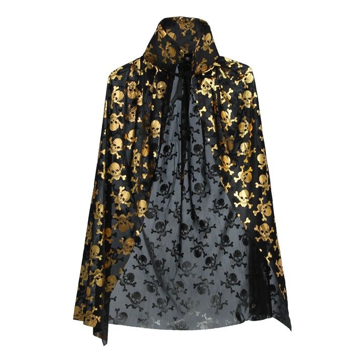 Черная накидка с черепами - это черная полупрозрачная накидка с золотистым рисунком в виде черепов. Длина примерно 75 см. Накидка станет отличным атрибутом для празднования Хэллоуина и послужит хорошим дополнением к костюмам мистической тематики.