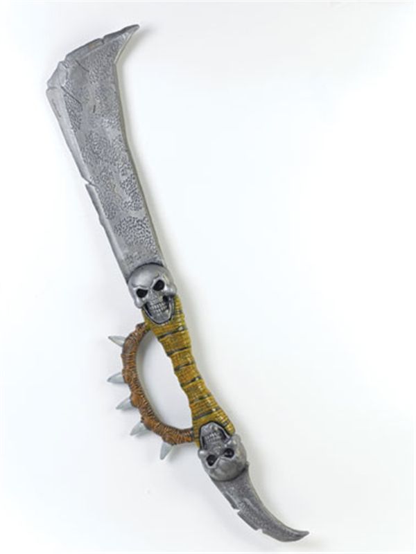 Меч - прекрасное дополнение к костюмам воинов. Рукоятка меча выполнена в коричневом цвете с острым концом, само лезвие изогнуто и выполнено в сером цвете. Меч украшен двумя серыми черепами. Размер меча около 90 см.