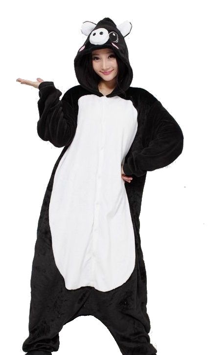 Кигуруми черной хрюшки имеет капюшон в виде головы забавного поросёнка с добрыми глазами и белыми ушками. Костюм застёгивается спереди на пуговицы и имеет свободный крой. Это одежда удобна для отдыха и сна.