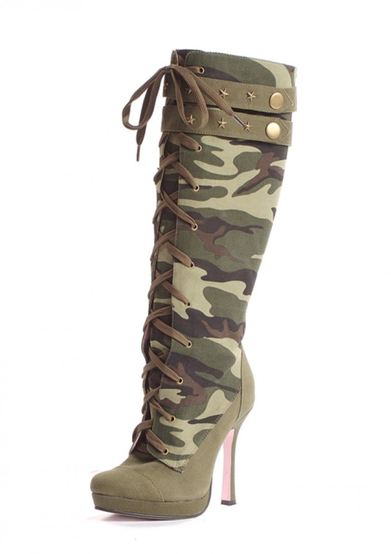 Сапоги сержантки армии - это высокие сапоги на небольшой платформе и каблуке около 11 см. Сапоги выполнены в камуфляжной расцветке, спереди имеется шнуровка. Сапоги украшают металлические кнопки и звездочки.