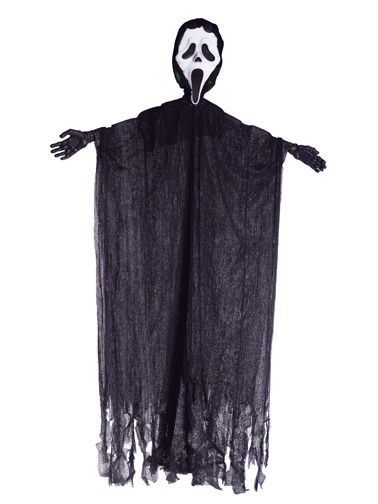 Наверняка все помнят фильм "Крик" и всем запомнилось это ужасающее лицо. Теперь вы можете подвесить своего любимого героя из фильма в своём доме. Чёрная рваная накидка с торчащими из под неё руками и то самое лицо - всё это и составляет подвесное призрачное лицо. Для того чтобы от призрачного лица исходил свет необходимы две батарейки (стандартные АА). Высота декорации 3 метра.