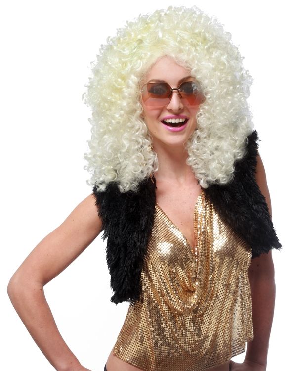 Светлый парик королевы диско выполнен из синтетических вьющихся волос, выкрашенных в светлые тона. Такой парик прекрасно дополнит костюмы диско див и прочие.