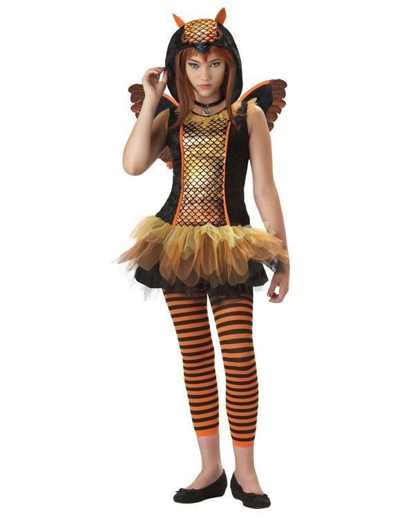 Подростковый костюм Совы сочетает в себе оранжевый и черный цвета. В комплекте этого милого костюма имеется коротенькое платье с пышной юбочкой и капюшоном с глазками и с ушками, полосатые черно-оранжевые леггинсы, крылья и колье не шею.