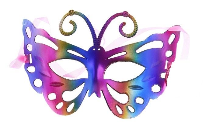 Маска бабочки разноцветная может стать дополнением к карнавальным костюмам феи или нимфы. Маска сделана из пластика и имеет размер 12х18 см.
