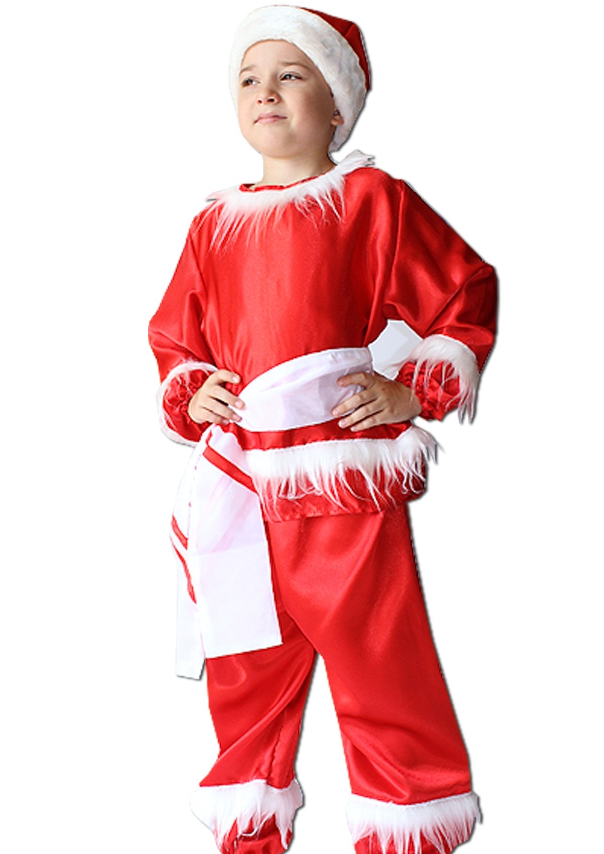 Детский костюм Морозко - красный новогодний костюм, в комплект которого входит красная кофта с меховой отделкой, красные штаны, белый пояс и новогодняя шапочка с белым меховым отворотом.