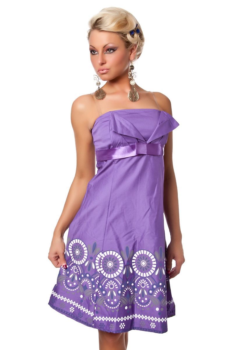 Лиловое платье с узором без бретелек прекрасно подчеркнет вашу фигуру, не смотря на то, что оно слекга расклешенное. Подол украшен различными узорами бело-фиолетового цвета. Платье без бретелек, но хорошо держится на теле. Под грудью по кругу проходит атласная ленточка с маленьким бантиком.