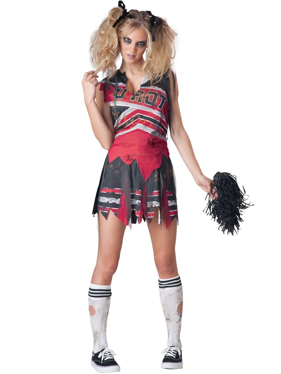 Костюм зомби-болельщицы станет оригинальным выбором для проведения вечеринки Хэллоуин или Пятница 13. Нарядитесь со своими подружками в одинаковые костюмы зомби-болельщиц и поддержите участников состязания на лучший костюм вечера. Костюм зомби-болельщицы состоит из юбки и футболки с принтом. К костюму прилагается помпон черного цвета.