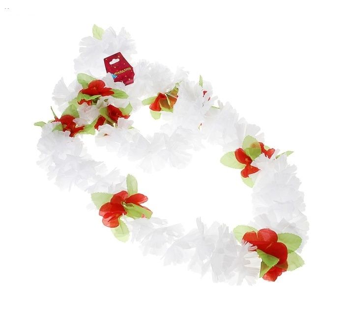 Белый гавайский набор с красными цветами и зелеными листочками включает в себя длинные бусы, венок на голову и два браслета. Набор подойдет для пляжной вечеринки и сделает вас богиней вечера.