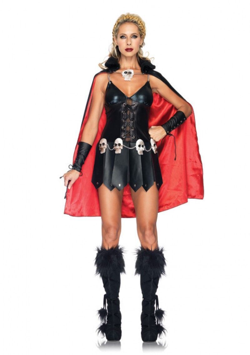 Костюм женщины воина включает в себя короткое черное платье из искусственной кожи на тонких бретельках. Спереди на платье имеется шнуровка. Оно украшено поясом из белых черепов. К платью прилагается накидка с меховым воротником и черные манжеты.