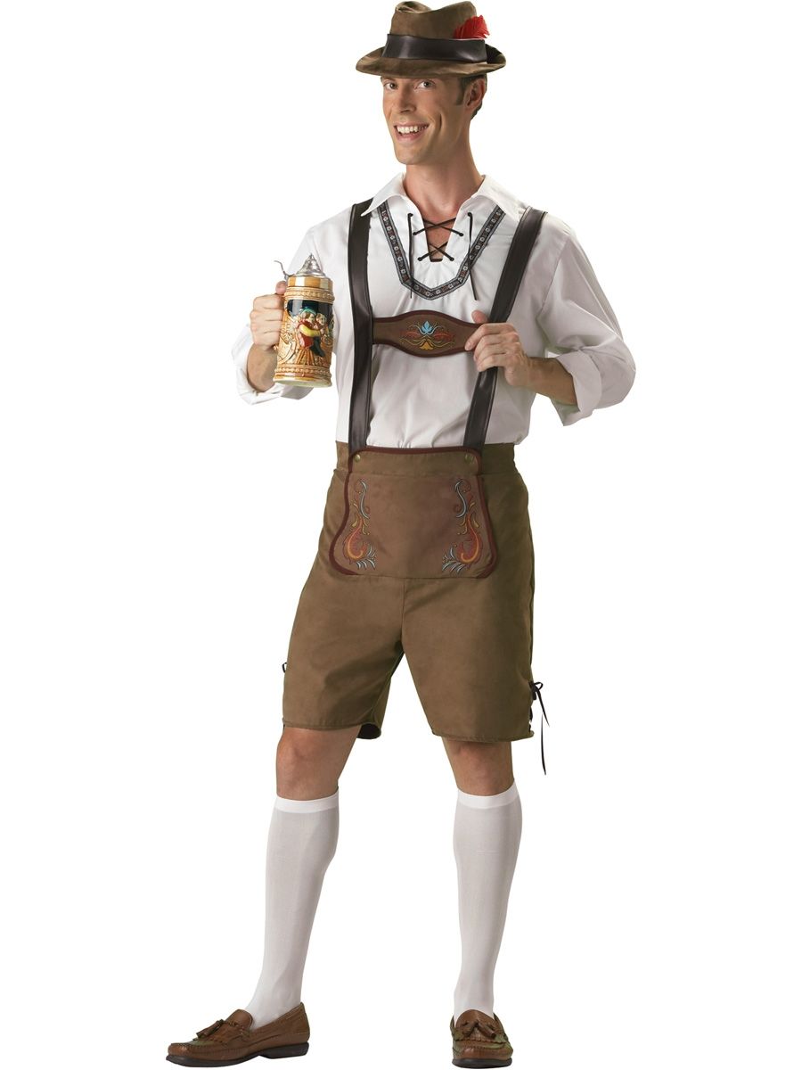 Костюм любителя пива для всех поклонников пивных вечеринок и праздника Октоберфест. Костюм включает в себя белую рубашку на шнуровке и узором спереди, коричневые шорты с виниловыми подтяжками, шляпу с красным пером и белые гольфы. В костюме любителя пива вы будете королем любой вечеринки.