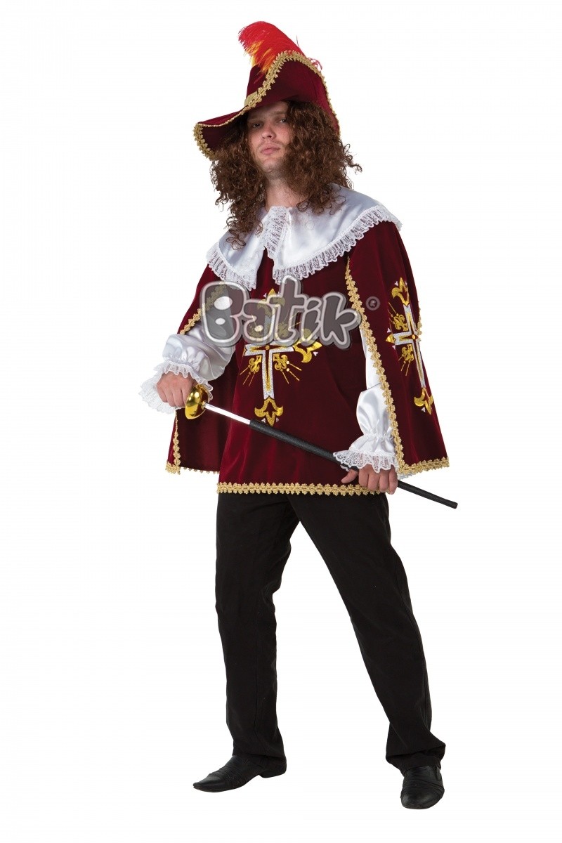 Костюм отважного мушкетера бордовый отлично подойдет для спектаклей и костюмированных мероприятий. В комплект костюма входит плащ бордового цвета из бархата с имитацией рубашки под плащом. Завершает образ шляпа с красным пером и парик с кудрявыми волосами.