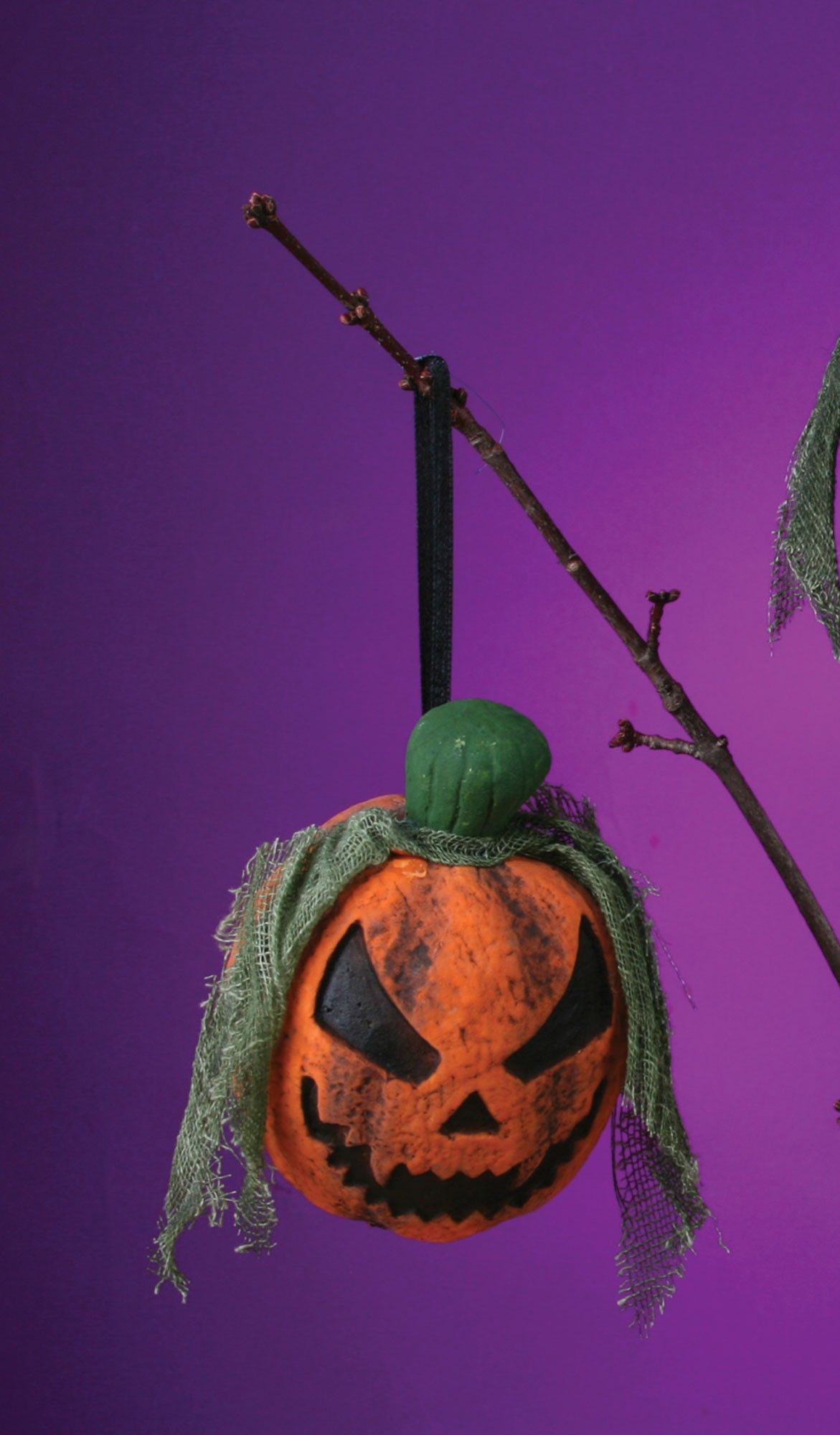 Подвесная мини-тыква оранжевая представляет собой небольшую фигурку в виде тыквы-головы. Тыква выполнена в оранжевом цвете, а вырезанные части лица в черном. Сверху тыкву покрывает зеленый рваный материал. Имеется шнурок для подвешивания.