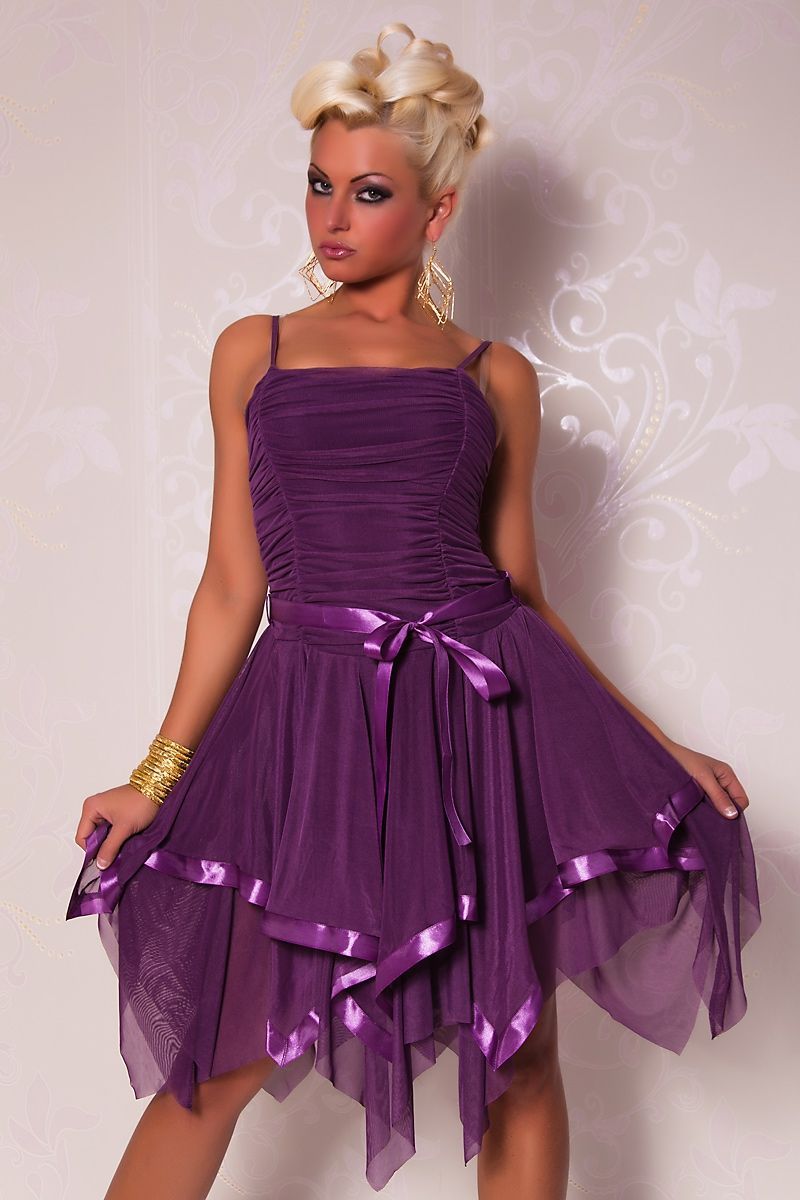 Легкое фиолетовое платье - это изящное вечернее платье из легкого шифонового материала. Платье украшено нежными атласными ленточками, верхняя часть платья имеет сборки. Многослойная легкая юбка с неровным подолом придает платью легкости.