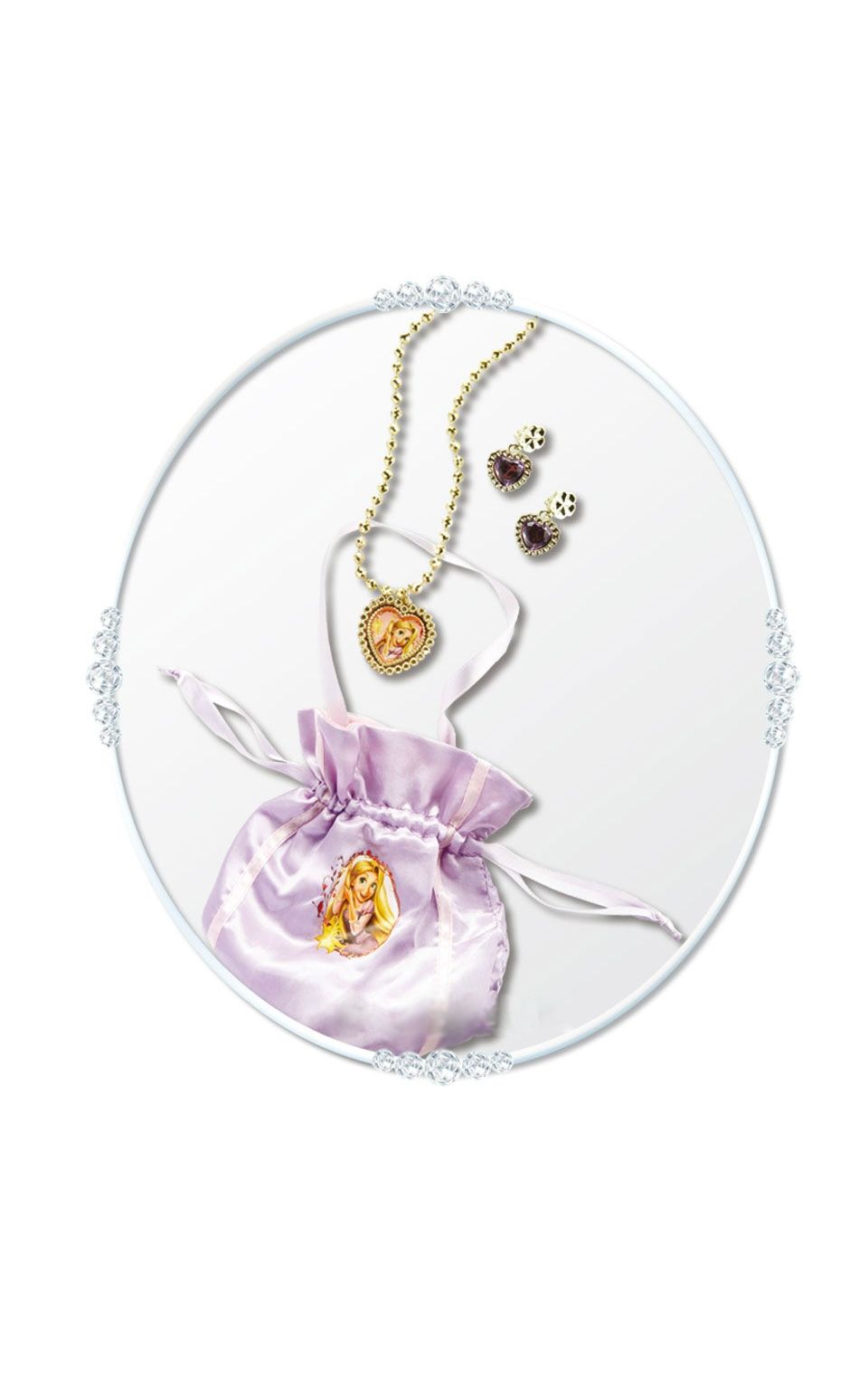 Сумочка с украшением Рапунцель - это атласная сумочка-мешочек с ручкой из тонкой ленточки. Мешочек затягивается. Также его украшает портрет Рапунцель. К нему прилагается золотистый кулон в виде сердца и пара сережек.