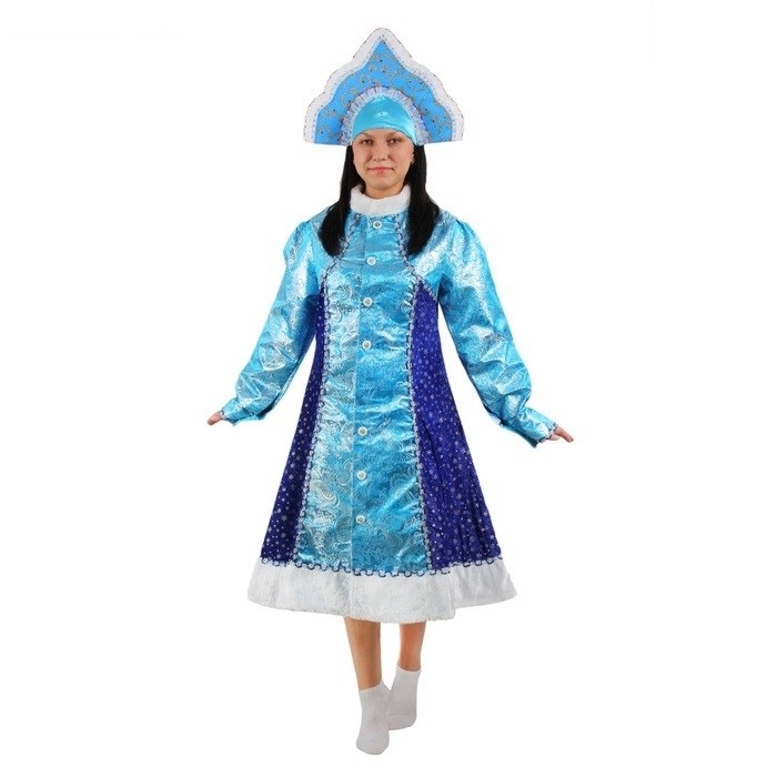 Атласный костюм Снегурочки включает в себя платье голубого цвета с синими вставками по бокам. Платье на пуговицах украшено блестящими серебряными узорами. Также к нему прилагается голубой кокошник с золотистыми узорами.