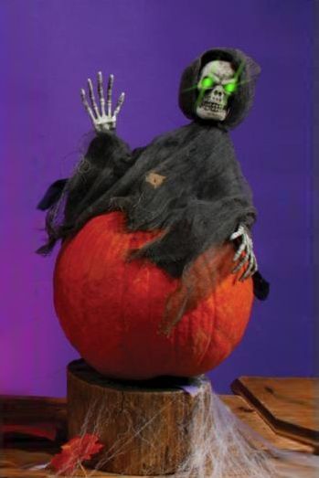 Украшение на тыкву в виде фигурки жнеца со светящимися глазами. Батарейки входят в комплект. Высота 22 см.