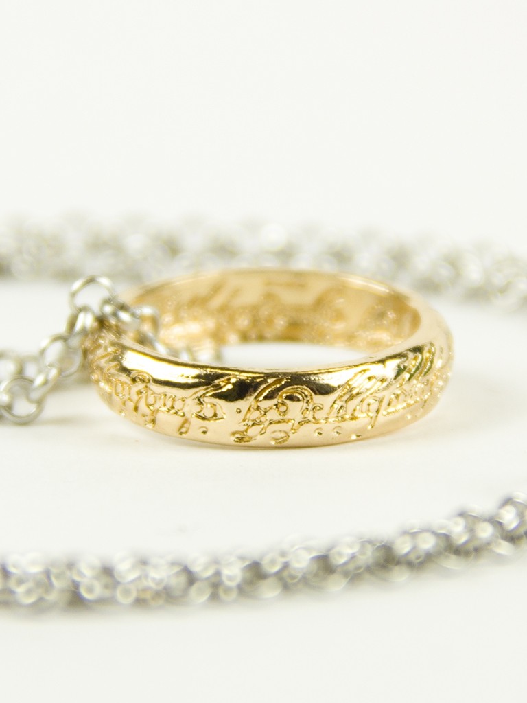 Золотое кольцо Всевластия - отличное дополнение к образам из фильма "Властелин колец". Кольцо выполнено в золотистом цвете и украшено объемной надписью на эльфийском языке. Кольцо крепится к серебристой цепочке.