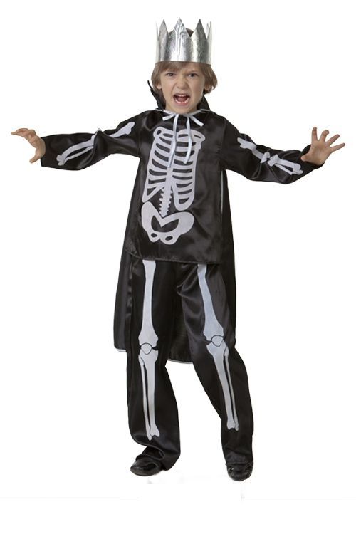 В комплект костюма Кащея Бессмертного входят курточка и брюки с изображением костей, плащ и корона.