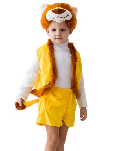 Костюм маленького левушки - яркий желтый костюм, в комплект которого входят короткие шортики с хвостом, жилетка с коричневой меховой отделкой, а также меховая шапочка-маска в виде мордочки льва.