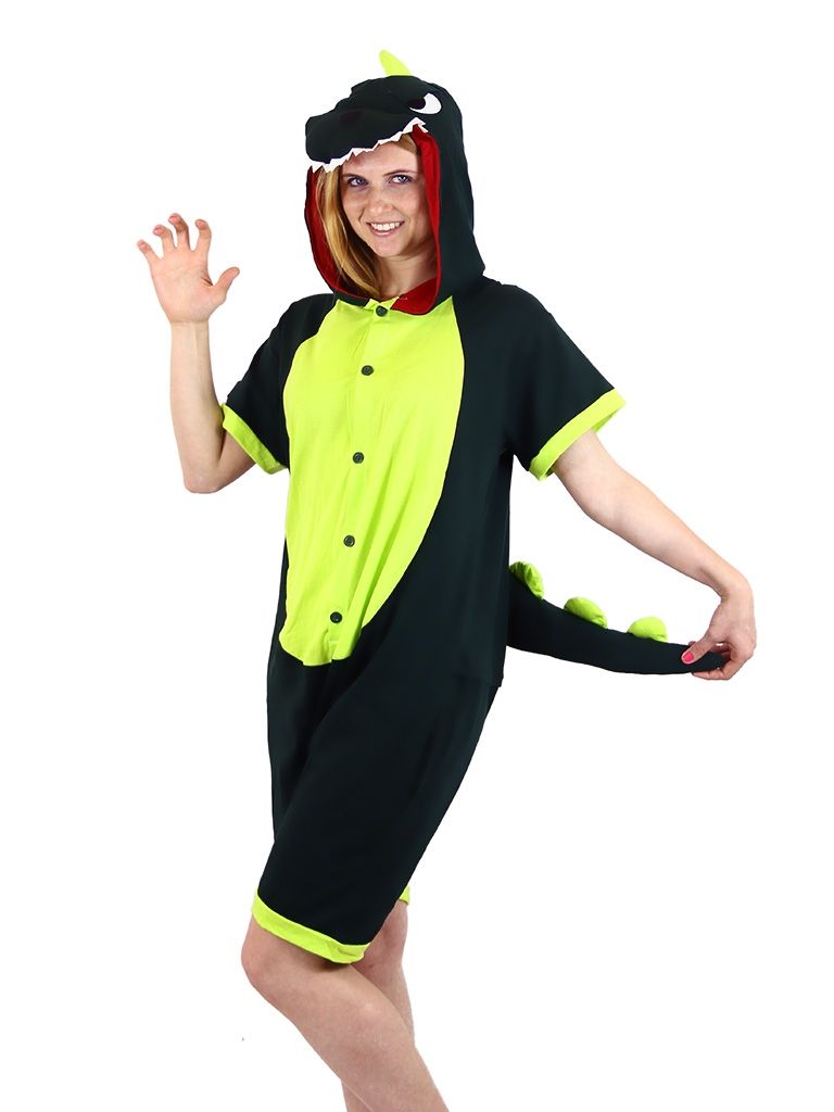 Пижама-кигуруми Дракон с шортиками - темно-зеленая пижама с салатовой отделкой и вставкой спереди. Кигуруми застегивается на маленькие пуговицы. Капюшон выполнен в виде мордочки дракона с белыми зубами. Также к кигуруми крепится длинный хвост.
