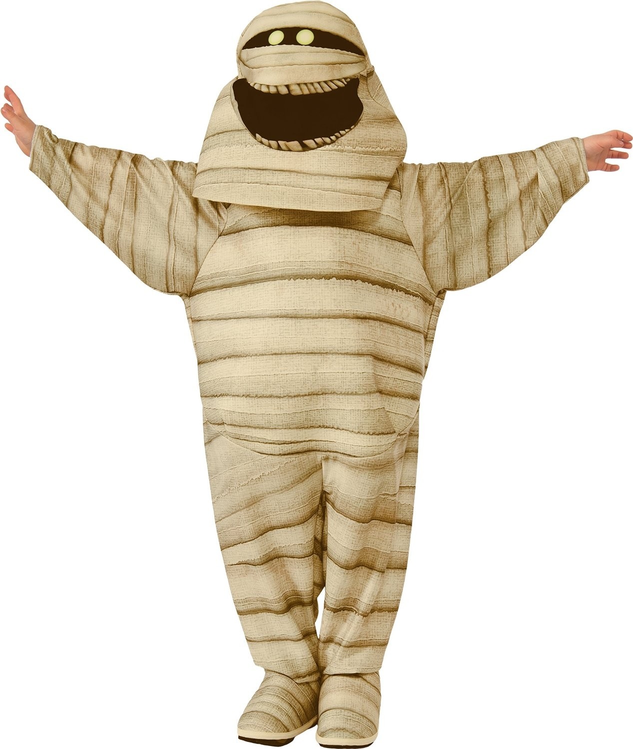 В комплект костюм входит комбинезон с принтом бинтов, а также маску с принтом рожицы мумии из мультфильма.