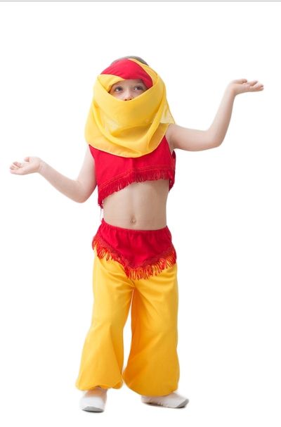 Костюм маленькой Шахерезады - это яркий желто-красный костюм, включающий в себя головной убор, короткий топ, а также желтые брюки-шаровары.