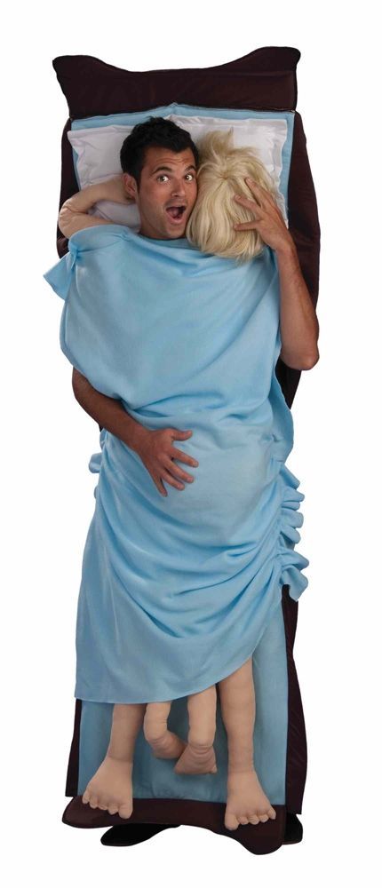 Костюм Секс в постели представляет собой тунику на все тело, которая имитирует, то что вы лежите на кровати, а на вас девушка-блондинка, вы укрыты одеялом из под которого торчат ноги. Такой забавный костюм сможет оценить каждый на вечеринке.