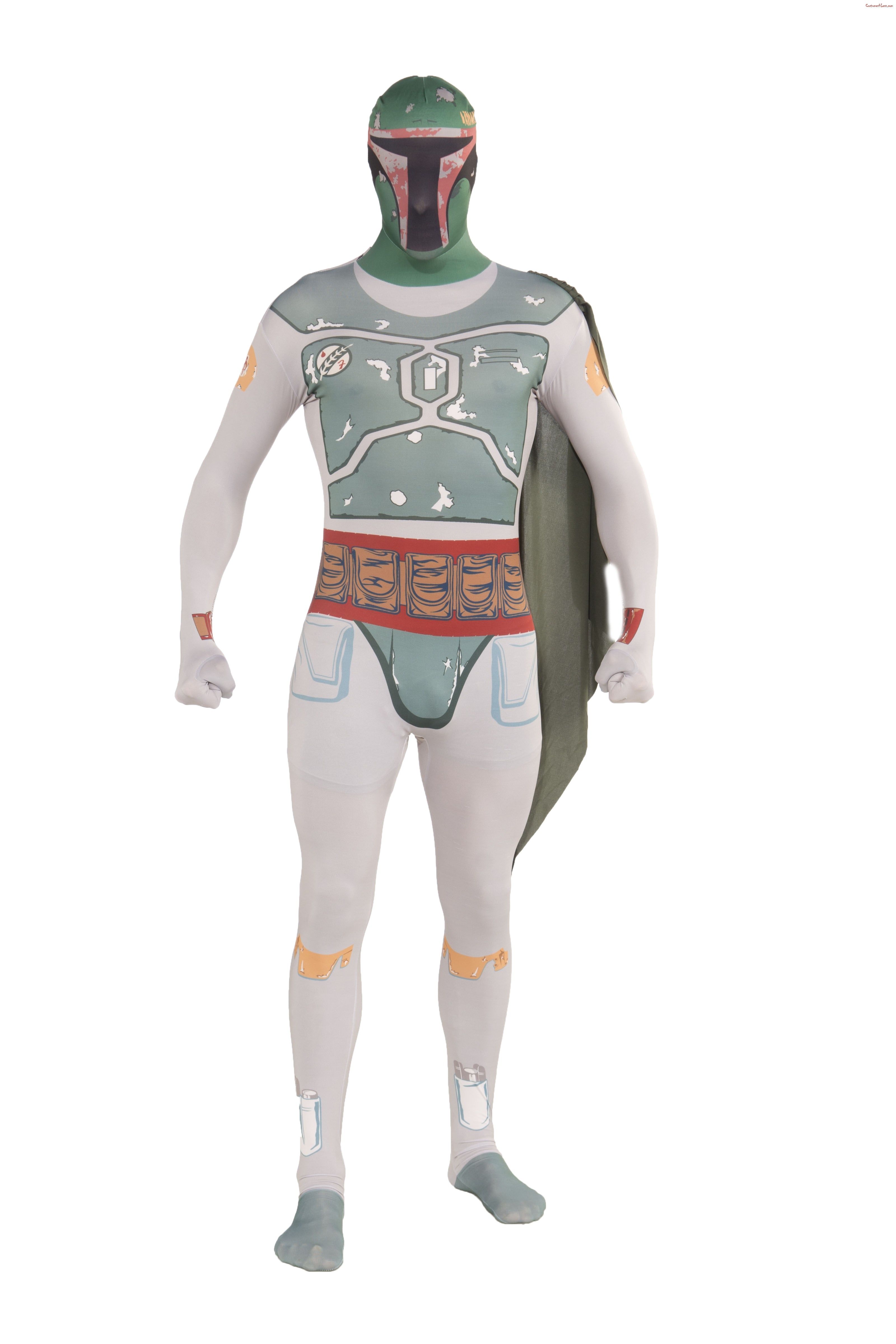 Костюм Боба Фетт вторая кожа - незначительного персонажа из саги "Звёздные войны". Костюм выполнен в сером цвете с цветным принтом. Он покрывает все тело с головой. Также к нему крепится плащ-накидка.