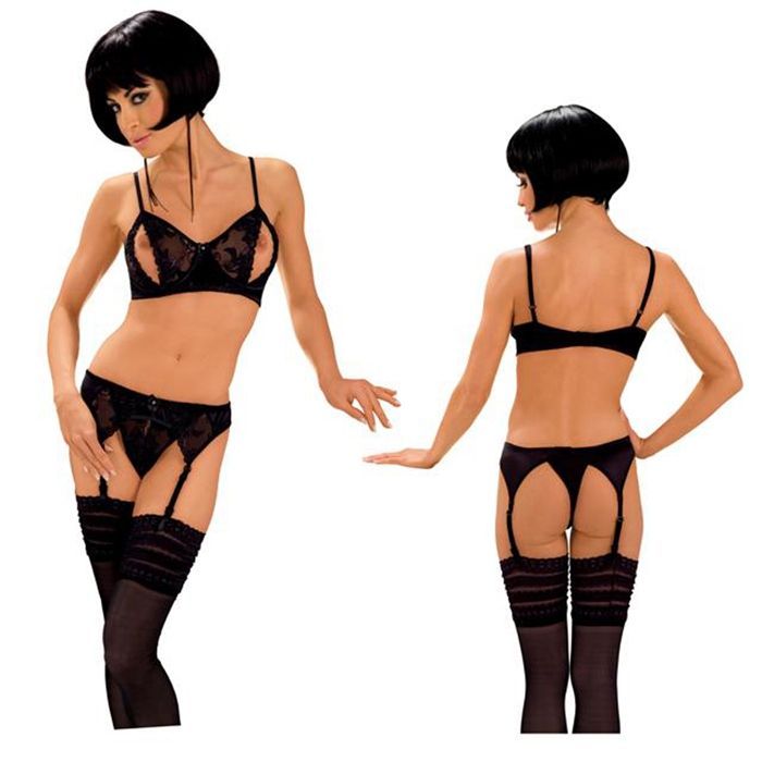 Комплект белья черный с разрезами на чашках. Бюстгальтер на косточках имеет мягкие и регулируемые ремни, которые позволяют моделировать и подчеркивать бюст, пояс имеет регулируемые подвязки, так что вы можете установить соответствующую длину. В комплекте: бюстгальтер, пояс, стринги.