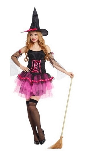 Розовый костюм кокетливой ведьмочки позволит Вам примерить образ самого популярного персонажа Хэллоуина. Костюм включает в себя платье с пышной юбочкой и имитацией корсета с розовой шнуровкой, классическую конусовидную шляпу и полупрозрачные нарукавники. Другие аксессуары Вы также можете приобрести в нашем магазине.