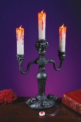 Готический канделябр со свечами выполнен в старинном стиле. Канделябр украшен черепами. В каждом ответвлении имеется светодиодная свеча с лампочкой в виде небольшого огня. С каждой свечи стекает искусственная кровь. Высота канделябра около 35 см.